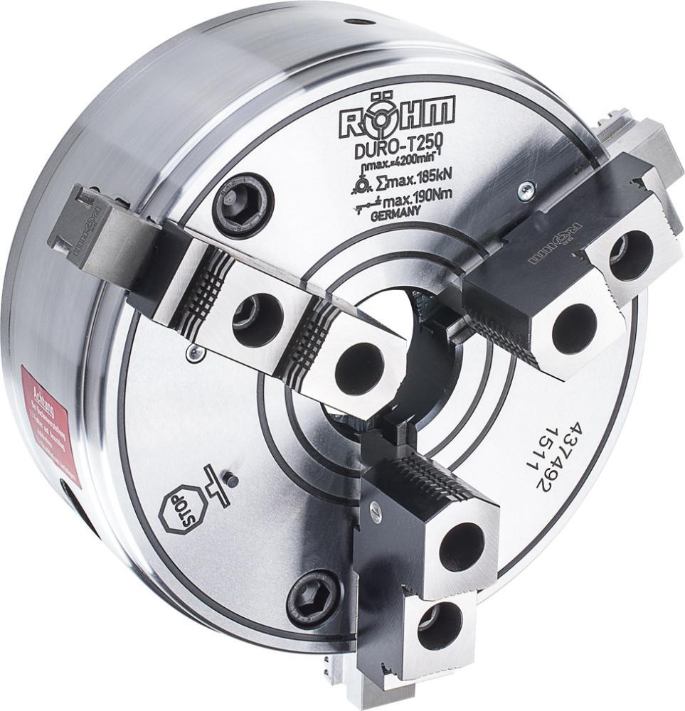 Trojochomý sústružnícky sklíčidlo s klinovou tyčou DURO-T Vyhotovenie: Telo sklíčidla je kompletné povrchovo kalené a vyvážené. Čelisti v sklíčidle sú vybroušené na obvodovú házivosť. Tolerancia radiálnej a čelnej házivosti je dvakrát presnejšia, než nařizuje norma DIN 69386/I. Rýchlovýmenný systém čelistí, vizuálna značka pre rýchlu výmenu čelistí a zabezpečenie čelistí. Intenzívna protikorózna ochrana a vonkajší obrys s hranou proti striekajúcej vode. Dobré možnosti mazania veľmi namáhaných klzných plôch. Použitie: Pre sústruženie s požiadavkou na vysoké upínacie sily, presnosť obvodovej házivosti a presnosť opakovania. Rozsah dodávky: So základnými čelistiami a obojstrannými nástavbovými čelistiami a bezpečnostným kľúčom. Výrobca: Röhm GmbH, Heinrich-Röhm-Straße 50, 89567 Sontheim, DE, +497325160, info@roehm.com