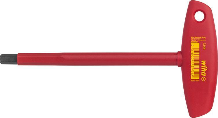 VDE inbusový kľúč s T-rukoväťou, šesťhran Vyhotovenie: Z chrómvanádiovej ocele, nepretržite kalené a v mangánovom fosfátovaní. Rukoväť izolovaná do 1000 V podľa IEC 60900, DIN EN 60900. S ergonomickou plastovou rukoväťou a otvorom na zavesenie. Výrobca: Wiha Werkzeuge GmbH, Obertalstraße 3-7, 78136 Schonach, DE, +4977229590, info.de@wiha.com
