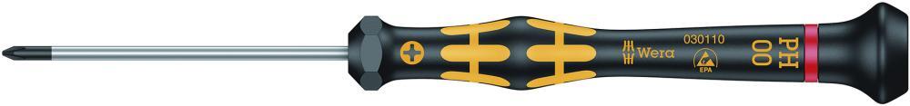 Křížový šroubovák ESD PH pre elektroniku Provedenie: S guľatou čepeľou z vysoko legovanej špeciálnej ocele a hrotom Black Point pre vyšší krútiaci moment a rozmerovú presnosť. S ergonomickou viaczložkovou rukoväťou Kraftform-Micro s integrovanými mäkkými plochami pre lepšie uchopenie, ochranou proti odvaleniu a otočnou hlavou pre rýchle zatočenie. S koncepciou troch zón (zónou presného, silného a rýchleho otáčania) pre ergonomicky lepšiu manipuláciu. Použitie: Vhodný pre presné, účinné a časovo úsporné skrutkovanie. Ideálny pre citlivé nastavovacie práce, napr. použiteľný v oblasti elektroniky a v ďalších odboroch, ktoré vyžadujú použitie skrutkovačov ESD. Výrobca: Wera Werkzeuge GmbH, Korzerter Str. 21-25, 42349 Wuppertal, DE, +4920240450, sales@wera.de