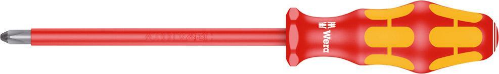 Šroubovák VDE krížový PH Provedenie: Z vysoko legovanej špeciálnej ocele. S guľatou izolovanou čepeľou. Rukoväť a čepeľ s izoláciou do 1000 V podľa IEC 60900 napr. DIN EN 60900. Okrem toho majú skrutkovače na hlave vyrazený symbol zakončenia a veľkosť. S lasertipom a mikrodrsným povrchom. Redukuje potrebnú pritlačnú silu a zabraňuje vyklznutiu z hlavy skrutky. S ergonomickou viaczložkovou rukoväťou v silovom tvare Plus s integrovanými mäkkými plochami pre lepší úchop a s ochranou proti odvaleniu. Výrobca: Wera Werkzeuge GmbH, Korzerter Str. 21-25, 42349 Wuppertal, DE, +4920240450, sales@wera.de