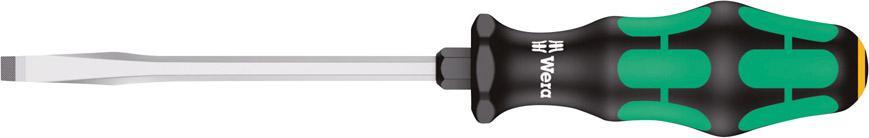 Ploché skrutkovače so šesťhrannou čepeľou Vyhotovenie: Z vysoko legovanej špeciálnej ocele so šesťhrannou čepeľou a šesťhranným pomocným kľúčom pre vyšší účinok s vidlicovými alebo očkovými kľúčmi. Okrem toho majú skrutkovače na hlave vyrazený symbol zakončenia a veľkosť. S lasertipom a mikrodrsným povrchom. Redukuje potrebnú prítlačnú silu a zabraňuje vyklznutiu z hlavy skrutky. S ergonomickou viaczložkovou rukoväťou v silovom tvare Plus, s integrovanými mäkkými plochami pre lepšie uchopenie, tvrdými plochami pre vysokú pracovnú rýchlosť a ochranou proti odvaleniu. Výrobca: Wera Werkzeuge GmbH, Korzerter Str. 21-25, 42349 Wuppertal, DE, +4920240450, sales@wera.de