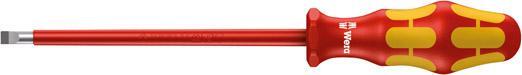 Ploché skrutkovače VDE Vyhotovenie: Z vysoko legovanej špeciálnej ocele. S guľatou izolovanou čepeľou. Rukoväť a čepeľ s izoláciou do 1000 V podľa IEC 60900 napr. DIN EN 60900. Okrem toho majú skrutkovače na hlave vyrazený symbol zakončenia a veľkosť. S lasertipom a mikrodrsným povrchom. Redukuje potrebnú prítlačnú silu a zabraňuje vyklznutiu z hlavy skrutky. S ergonomickou viaczložkovou rukoväťou v silovom tvare Plus s integrovanými mäkkými plochami pre lepší úchop a s ochranou proti odvaleniu. Výrobca: Wera Werkzeuge GmbH, Korzerter Str. 21-25, 42349 Wuppertal, DE, +4920240450, sales@wera.de