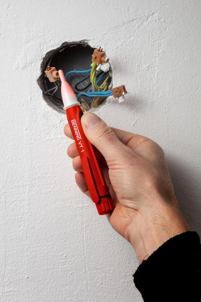 Skúšačka fáz VT 1, induktívna Vyhotovenie: Striedavý prúd. Z ABS plastu s odolnosťou proti prasknutiu, s po celom obvode červené svietiacim skúšobným hrotom, akustickým signalizačným čidlom a izolovaným plastovým klipom. Dodávame vrátane 2 mikro batérií AAA/LR03. Použitie: Na bezdotykové skúšanie fáz na zásuvkách a krabicových odbočniciach, samočinných poistkách atď. a rovnako na detekciu prerušených káblov a prerušenia na izolovaných vodičoch, ktoré sú pod napätím. Výrobca: Benning Elektrotechnik u. Elektronik GmbH & Co.KG, Münsterstr. 135-137, 46397 Bocholt, DE, +492871930, info@benning.de