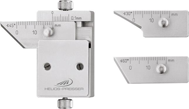 Merač faziet Vyhotovenie: Z nerezovej ocele s matne chrómovanými stupnicami, s vymeniteľnými meracími lištami, pre úkosy 30°, 45° a 60°. Strana dorazu je prestaviteľná, pomocou aretačného skrutky na meracie lišty a dorazovú stranu. Dodáva sa so skúšobnými pravítkami 30°, 45° a 60°. Použitie: Pre súčasnú kontrolu uhla zkosenia a rozmerovej presnosti. Výrobca: Mahr GmbH, Carl-Mahr-Str. 1, 37073 Göttingen, DE, +49 551 7073 0, info@mahr.com