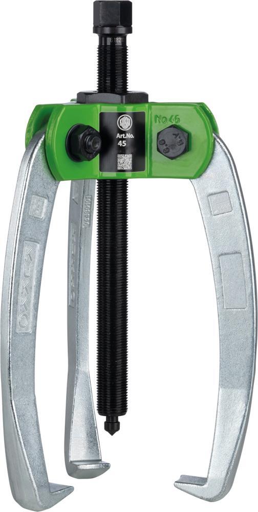 Stahovák, trojramenný, zápustkově kovaný, model 45 Provedení: S vysoce zatížitelnými, samostatně centrovacími, úzkymi stahovacími háky pre prenos sily z chrómom legovanej nástrojovej ocele. S automatickým nastavením rukoväte a zušľachteným tlačným vretienkom so špeciálnym povlakom s mimoriadne dobrými klznými vlastnosťami. Voľne otočný stredový hrot, vymeniteľný a presaditeľný (guľôčka/hrot). Silný model. Použitie: Najmä na stahovanie zvlášť tesných ozubených kolies, pastorkov, guľôčkových ložísk, pásových strojov atď. Automatické samonapínanie a centrovanie spúšťacích hákov. Výrobca: Kleinbongartz & Kaiser oHG, Heinrich-Hertz-Str. 5, 40721 Hilden, DE, +4921039754400, info@KUKKO.com