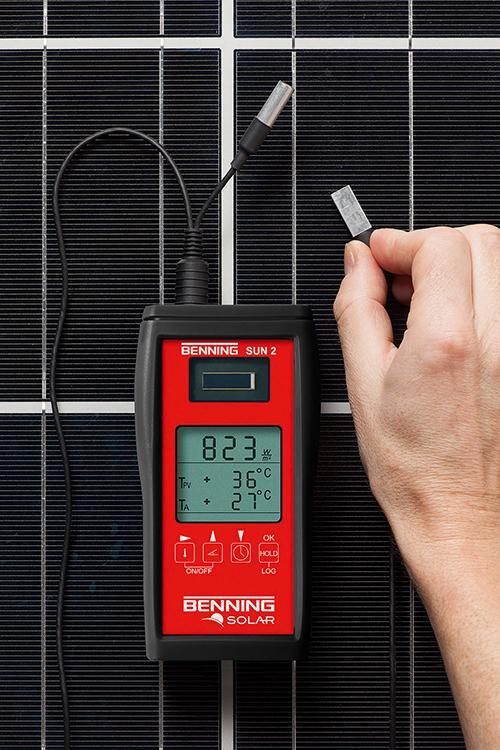 Skúšačka fotovoltaických inštalácií PV 2 SET Vykonanie: Automatický priebeh testu, bezpečné meracie pripojenie aj v prípade prívodu energie PV zariadenia. Pamäť nameraných hodnôt pre 999 fotovoltaických prívodov, USB rozhranie pre stiahnutie nameraných hodnôt. Integrované hodiny reálneho času na ukladanie nameraných hodnôt s dátumom a časom. Meranie charakteristickej krivky napätia (I-U) vrátane charakteristickej krivky výkonu (P-U). Priame pripojenie ku všetkým štandardným fotovoltaickým modulom s konektorom MC4 alebo Sunclix. Použitie: Pre inštalačné a pravidelné servisné testy fotovoltaických systémov pripojených do napájacej elektrickej siete v súlade s VDE 0126-23 (DIN EN 62446) a DIN EN 61829 (VDE 0126-24) na preukázanie údajov o výkone. Vhodné pre prevádzkovateľov solárnych zariadení (prvé uvedenie do prevádzky, pravidelné servisné testy, hľadanie závad), odborných poradcov v oblasti fotovoltaických zariadení, ako aj pre servisné, úklidové a údržbové tímy. Rozsah dodávky: Meracie prístroje PV 2 a SUN 2, meracie káble, krokosvorky, meracie káble MC4/Sunclix, softvér SOLAR Manager pre PC, kábel micro USB, puzdro a batérie. Výrobca: Benning Elektrotechnik u. Elektronik GmbH & Co.KG, Münsterstr. 135-137, 46397 Bocholt, DE, +492871930, info@benning.de
