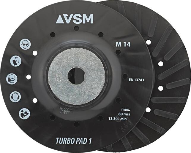 Oporný talíř Prevedenie: Kompletné z gumy, s chladiacimi rebrami. So závitom M14. Použitie: Pre náročné aplikácie na uhlovej brúse so strednými či vysokými otáčkami. Vejárové rebrá sú výstuhou v oporných talíroch a spoločne s ďalšími otvormi zabezpečujú lepšiu cirkuláciu vzduchu, ktorá zásadne znižuje teplotu, ktorá sa počas brúsenia vytvára. Vďaka chladnému brúseniu sa predlžuje životnosť fíbrových brúsnych kotúčov. Výrobca: VSM Vereinigte Schmirgel-u. Maschinen-Fabriken AG, Siegmundstr.17, 30165 Hannover, DE, +4951135260, info@vsmag.de