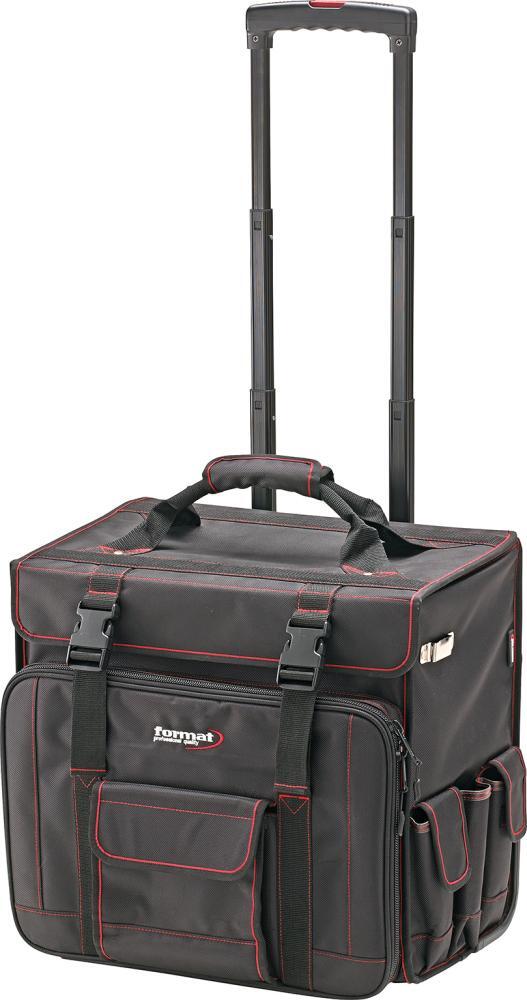 Taška na náradie s kolieskami, nylon Prevedenie: Z pevnej a odolnej nylonovej tkaniny (1680 D), čiernej farby, so zosilnenými stenami, dnom a tromi extra veľkými nožičkami. Vodoodpudivé, priedušné a ľahká údržba. Stabilný trojnásobný teleskopický výsuv, vysúvateľný o 1 m a tri široké profilované kolieska zabezpečujú ľahkú prepravu. S polstrovanou rukoväťou. Môže sa uzavrieť na suchý zips a dvoch patentných uzáveroch. Dodáva sa bez obsahu. Vybavenie: 6 zásuvnými priehradkami vo veľkej hlavnej priehradke 5 zásuvnými priehradkami na vyberateľnej strednej stene 1 veľkou nasadenou kapsou so zipsom 1 polstrovanou priehradkou na dokumenty, notebook atď. do cca 400 x 35 x 280 mm 1 vnútornou priehradkou so zipsom 4 vonkajšími kapsami na suchý zips 1 zásuvnou priehradkou na vonkajšej strane 1 klipom na svinovací meter Výrobca: Einkaufsbüro Deutscher Eisenhändler GmbH, EDE Platz 1, 42389 Wuppertal, DE, +4920260960, webkontakt@ede.de