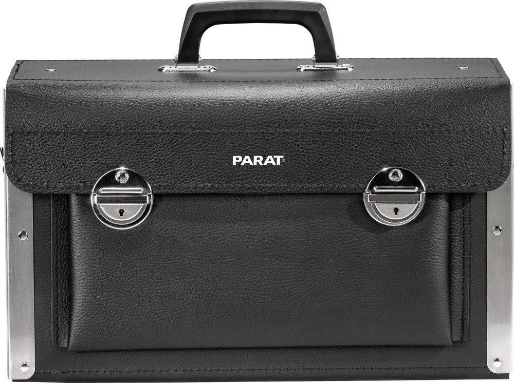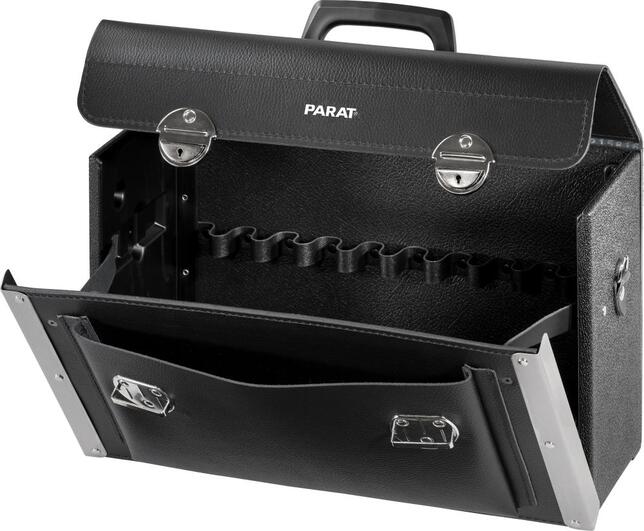 Taška na náradie NEW CLASSIC Allround Provedenie: Klopa z razenej hovädzej kože, s ergonomickou rukoväťou na prenášanie. S robustnými stenami z hovädzej kože a hliníkom vystuženým telom tašky. Veľmi stabilná a s ochrannými, integrovanými klzákmi. Zamykateľná 2 zástrčnými zámkami. Dodáva sa bez obsahu. Vybavenie: 11 prestaviteľných pútok na čiastočne výklopnej prednej stene 9 pevných pútok na zadnej stene 1 svieracia priehradka na čiastočne výklopnej prednej stene Výrobca: PARAT Solutions GmbH, Gewerbegebiet Manzing 7, 94065 Waldkirchen, DE, +498581999920, info@parat.de