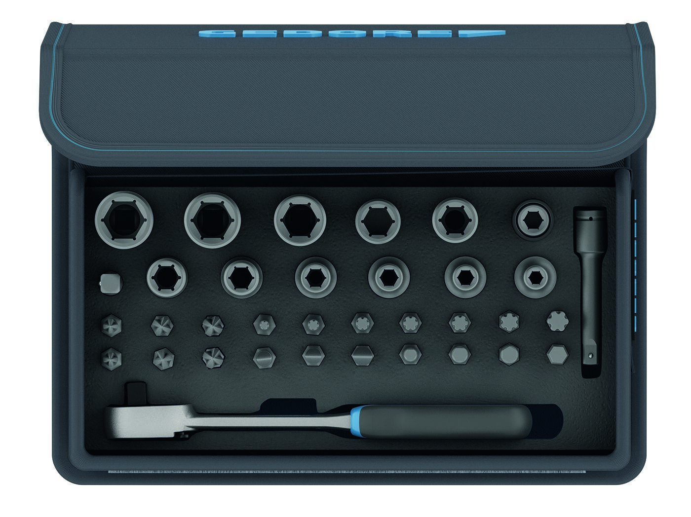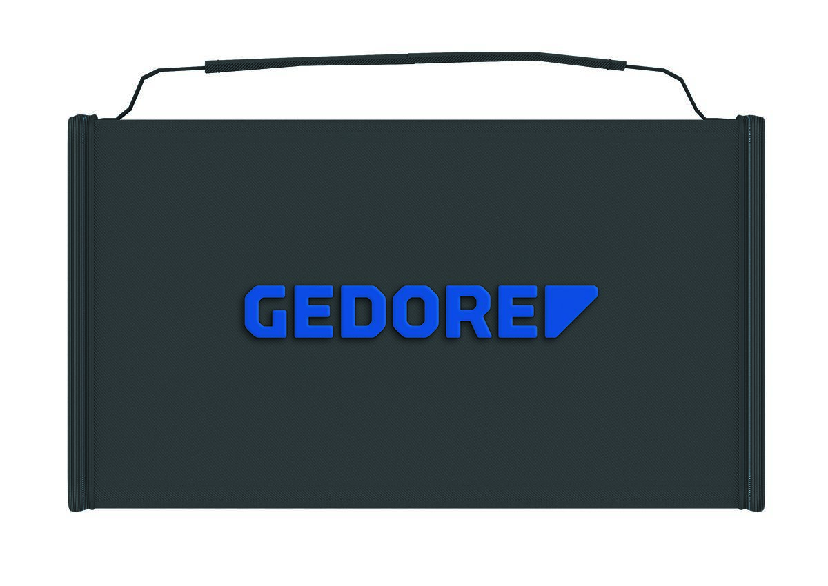 Najmä tenké 1/4" zásuvky, Vhodné na strojovú a ručnú prácu, Odolná textilná taška s pevným uzáverom na suchý zips a držadlom na prenášanie, Nástroje vždy po ruke v vodoodolných a špinavým odolných vreckách, keď sú v pohybe, Nástroje uložené na protišmykovej ploche, Systém kontrolných nástrojov GEDORE