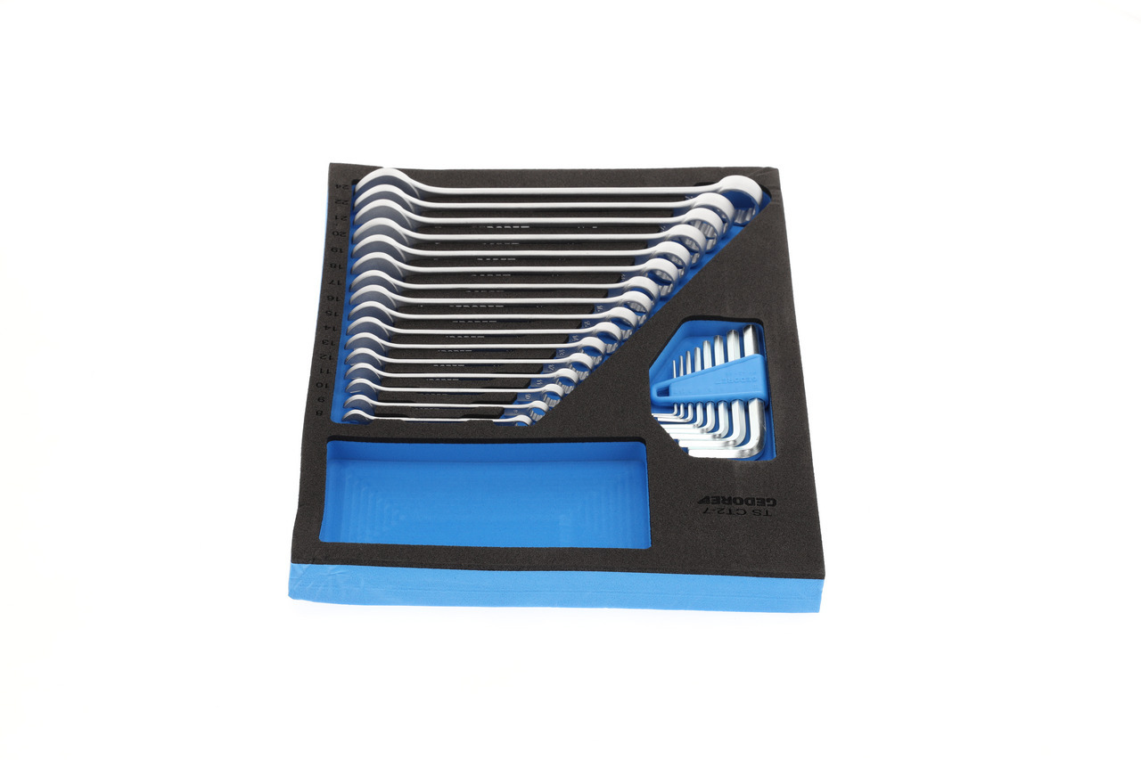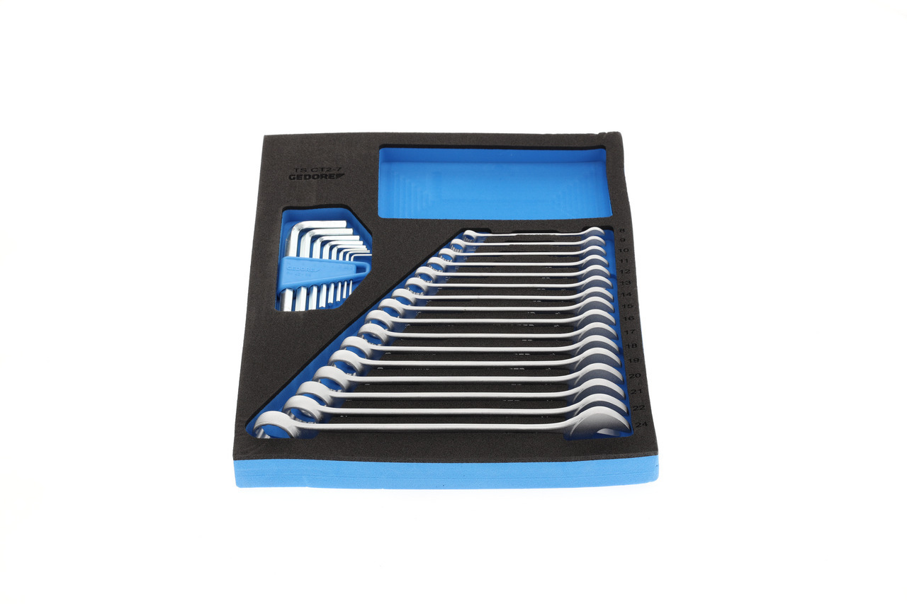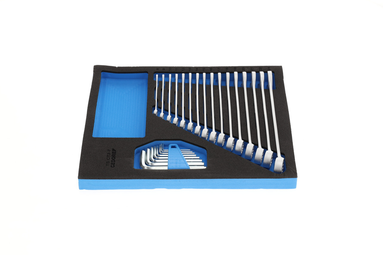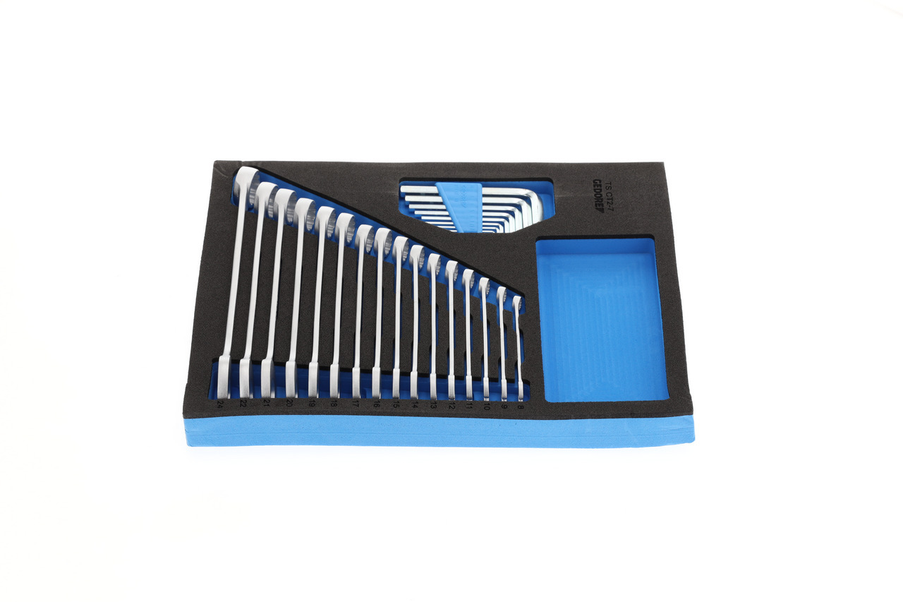 Rozmery: 316,5 x 390 x 35 mm, Jednoduchá optická kontrola úplnosti vďaka dvojfarebným penovým vložkám, Obzvlášť vhodné na prácu v citlivých oblastiach, kde je potrebné zabezpečiť, aby po sebe nezostávali žiadne nástroje, Základná vrstva modrá, vrchná vrstva čierna. Farba modrá označuje chýbajúce nástroje, Nástroj leží protišmykovo v hniezde a je chránený pred poškodením., Vstavané úchyty uľahčujú demontáž nástroja, Jasne viditeľné kontúry nástroja uľahčujú jeho opätovné vloženie do správneho hniezda, Odolnosť voči olejom a tukom, Ľahko sa čistí vodou, mydlom a kefkou na ruky/ nechty