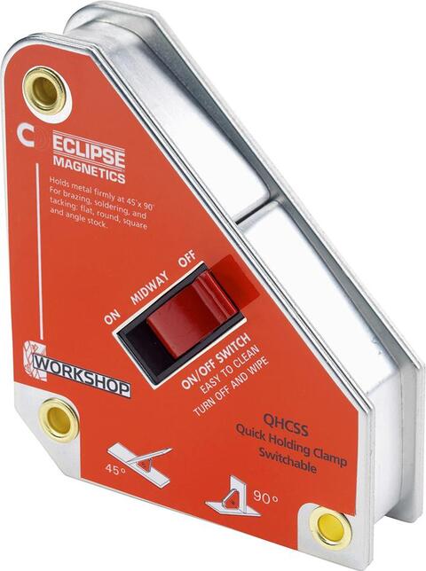 Svařovacia pomôcka, spínateľná Provedenie: S vypínačom, vďaka čomu je možné magnet zapnúť, keď je namontovaná pomôcka na zváranie. Rýchla a bezpečná montáž. Jednoduchý, utierateľný dizajn. Použitie: Pre rýchle a jednoduché upevňovanie guľatých a štvorhranných rúrok a tiež zalomeného a plochého materiálu v uhloch 45° alebo 90°. Magnetická sila je daná najdlhšou stranou magnetu s oceľou o hrúbke 10 mm. Výrobca: Eclipse Magnetics Ltd, Atlas Way, Atlas North, Sheffield S4 7QQ, Anglicko, GB, +441142250600, sales@eclipse-magnetics.co.uk