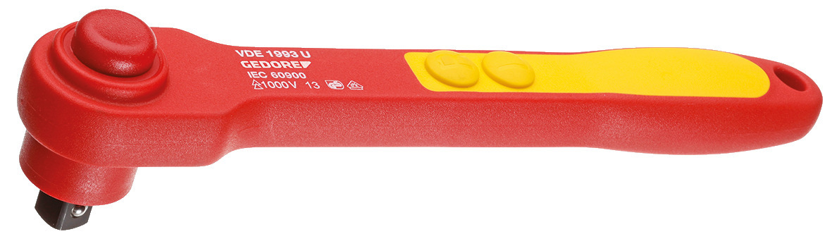 Hladko pracujúci a odolný, Absolútne bezpečné upevnenie príslušenstva vďaka blokovaniu tlačidlom s guľôčkou v štvorcovom pohone, Smer otáčania sa mení pomocou 2 tlačidiel s označeniami R a L na hriadeli, Štvorcový pohon podľa DIN 3120 - A 12,5, ISO 1174 vyrobený z ocele chrómovo-vanádiovej 31CrV3, Izolácia VDE do 1000 V podľa EN 60900/IEC 60900
