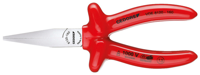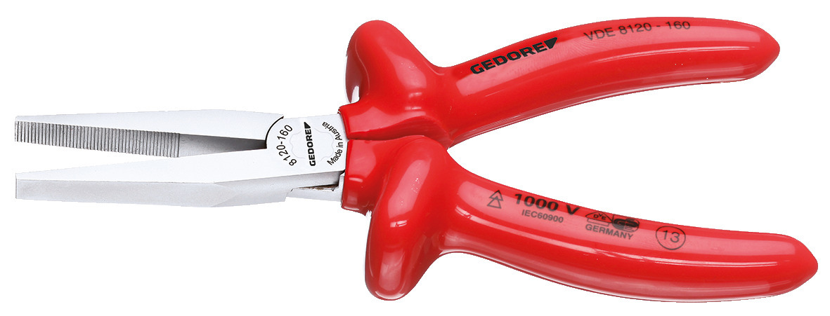 So širokými čeľusťami, zúbkované uchopovacie plochy, špeciálna oceľ GEDORE na vylepšenie, kovaná v matrice, kalená v oleji a popúšťaná, Ramena s izoláciou VDE podľa EN 60900/IEC 60900