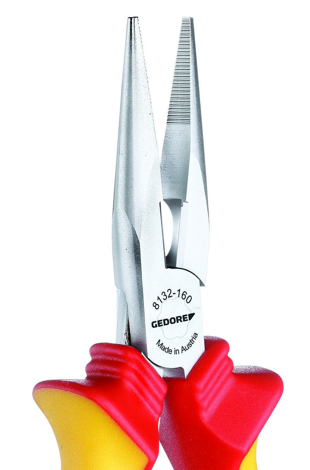 Plocho-kulaté, dlhé čeľuste, rovné úchopové plochy, zúbkované, na držanie, uchopenie, ohýbanie a strihanie, indukčne kalené presné ostria, tvrdosť ostrí 61 - 63 HRC, špeciálna oceľ GEDORE na zlepšenie, kovaná matrične, kalená v oleji a popúšťaná, ramená s izolačným obalom podľa EN 60900/IEC 60900