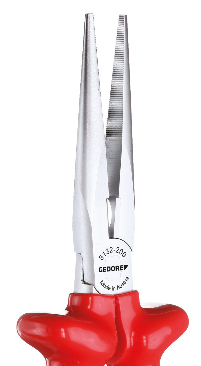 Plocho-kruhové, dlhé čeľuste, rovné uchopovacie plochy, zúbkované, na držanie, uchopenie, ohýbanie a rezanie, Indukčne kalené presné ostria, tvrdosť ostrí 61 - 63 HRC, Špeciálna oceľ GEDORE na zlepšenie, kovaná matrične, kalená v oleji a popúšťaná, Ramena s izoláciou VDE podľa EN 60900/IEC 60900