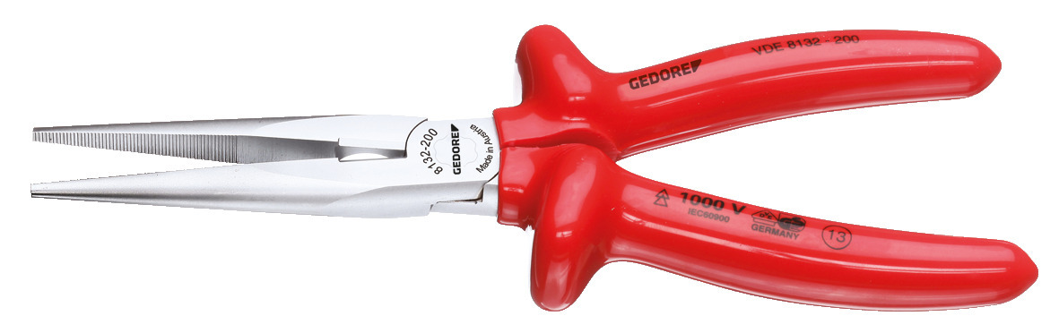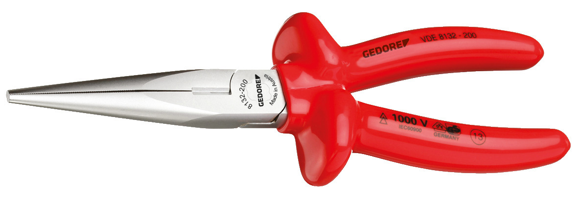 Plocho-kruhové, dlhé čeľuste, rovné úchopové plochy, zúbkované, na držanie, uchopenie, ohýbanie a rezanie, indukčne kalené presné ostria, tvrdosť ostrí 61 - 63 HRC, špeciálna oceľ GEDORE na zlepšenie, kovaná matrične, kalená v oleji a popúšťaná, ramená s izoláciou VDE podľa EN 60900/IEC 60900