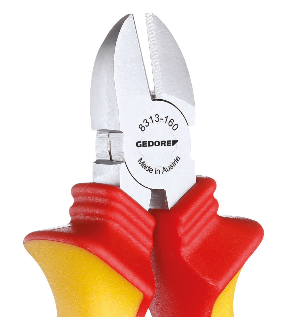 Úzka hlava, ideálna do tesných priestorov, Presné rezné hrany kalené indukčne, tvrdosť reznej hrany 63 - 65 HRC, Špeciálna oceľ GEDORE na zlepšenie, kovaná, kalená v oleji a popustená, Ramena s izolačným obalom podľa EN 60900/IEC 60900
