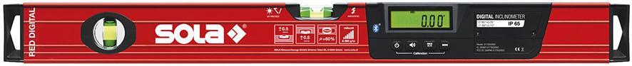 Digitálna vodováha RED DIGITAL Vyhotovenie: Z hliníkového obdĺžnikového profilu, s práškovým povrchom. Modul Solatronic na meranie sklonu. Trvalo osvetlený displej, otáča sa pri invertovanom meraní, zobrazenie v stupňoch, percentách, mm/m a mnoho ďalšieho. Akustické navádzanie na cieľ. Stupeň krytia IP65. Integrované rozhranie® Bluetooth. Funkcia pridržiavania (Hold) a automatického vypnutia. Presnosť merania libely: v normálnej a invertovanej polohe 0,5 mm/m. Presnosť merania v elektronickom režime: pri 0° a 90°: 0,05°, inak 0,1°. Použitie: Na horizontálne a vertikálne meranie v bežnej a invertovanej polohe, ako aj na meranie sklonu všetkého druhu. Upozornenie: Bezplatná aplikácia SOLA Measures dostupná pre iOS a Android. Výrobca: SOLA-Messwerkzeuge GmbH & Co. KG, Heuriedweg 69, 88131 Lindau (Bodensee), DE, +49838228585, sola@sola.de