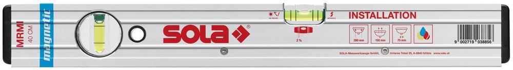 Inštalačná vodováha MRMI Vyhotovenie: Z hliníka, eloxovaná. So silným neodymovým magnetom. Metóda bočnej inštalácie magnetov do profilu vytvára priebežne rovný merací povrch pre presné a čisté výsledky merania. Štyri kruhové vodováhy pre umiestnenie na 2 % sklon. Stredovo umiestnená mm stupnica na hornej strane vodováhy na prenos rozmerov. Presnosť merania v bežnej polohe 0,5 mm/m. Presnosť merania v invertovanej polohe 0,75 mm/m Použitie: Na meranie v horizontálnej a vertikálnej normálnej a invertovanej polohe. Vzhľadom na mierku v mm a inštalačné rozmery ideálne pre inštalatérov, ďalej vďaka V drážke jednoduché umiestnenie na zaoblených dieloch (napr. rúry). Výrobca: SOLA-Messwerkzeuge GmbH & Co. KG, Heuriedweg 69, 88131 Lindau (Bodensee), DE, +49838228585, sola@sola.de