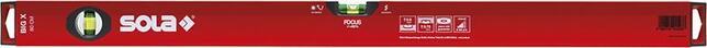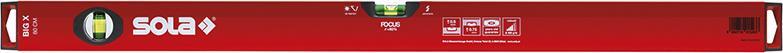Vodováha BIG X Provedenie: Obdĺžnikový profil z ľahkého kovu s koncovými krytkami tlmiacimi nárazy. Po 1 horizontálnej a vertikálnej libele. Obdĺžnikový profil z ľahkého kovu s koncovými krytkami tlmiacimi nárazy. Akrylové blokové libely so zväčšovacou šošovkou (+60%). Lepšia čitateľnosť za súmraku vďaka svetelnému osadeniu. Presnosť merania v normálnej polohe 0,5 mm/m, presnosť merania v obrátenej polohe 0,75 mm/m. Použitie: K horizontálnemu a vertikálnemu obvyklému meraniu a k meraniu v prechodovej polohe. Výrobca: SOLA-Messwerkzeuge GmbH & Co. KG, Heuriedweg 69, 88131 Lindau (Bodensee), DE, +49838228585, sola@sola.de