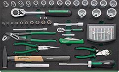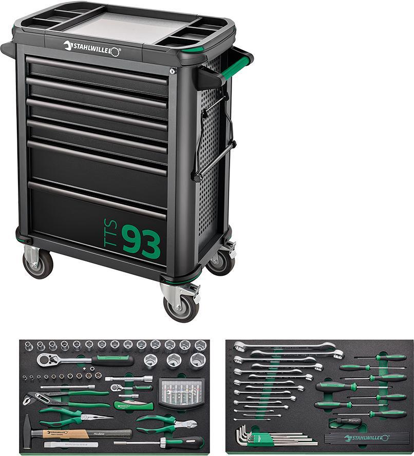 Dielenský vozík typ 93/130 so 130-dielnou sadou Provedenie: Stabilná konštrukcia z oceľového plechu, s 6 ľahko vyberateľnými zásuvkami (4 x 68; 1 x 145; 1 x 198 mm vysoká), s úplným výsuvom (370 mm), vedenie s guľkovou klietkou a ochranou proti prevrhnutiu, súčasné vytiahnutie viacerých zásuviek nie je možné. Bočné steny majú dierovanú štruktúru, jedna strana má držiak na papierové role. Centrálny zámok pomocou cylindrického zámku s odklápacím kľúčom. Odolná plastová odkladacia doska z ABS s priehradkami na malé diely. S kolieskami s ľahkým chodom (∅ 125 mm) odolnými voči oleju a kyselinám a ochranou ložiska, ktorá ložiská chráni pred nečistotami a vláknami, s dvoma ručnými brzdami. Zásuvky čierne, korpus antracitový s dvoma držadlami na jazdu a protinárazovou ochranou po obvode. Rozsah dodávky: 1 nástrojový modul nástrčné kľúče 97 kusov obsahuje: 10 hlavíc šesťhranných nástrčných kľúčov 1/4" 4; 5,5; 6; 7; 8; 9; 10; 11; 12; 13 mm 17 vložiek šesťhranných nástrčných kľúčov 1/2" 10; 11; 12; 13; 14; 15; 16; 17; 18; 19; 20; 21; 22; 24; 27; 30; 32 mm 2 predĺženia 1/4" 54; 150 mm 1 ráčna 1/4" 1 nástavec 1/2" 130 mm 1 ráčna 1/2" 1 ploché okrúhle kliešte, 200 mm 1 kliešte SIKO 240 mm 1 bočné štípacie kliešte, 160 mm 1 ráčna na bity 1 spojovací diel na bity 1 držiak na bity 1 ploché dláto 1 zámočnícke kladivo 1 nôž na káble 1 box na bity, 56 kusov 1 nástrojový modul vidlicových očkových kľúčov 33 ks, obsahuje: 15 krúžkových vidlicových kľúčov 6; 7; 8; 10; 11; 12; 13; 14; 15; 16; 17; 18; 19; 22; 24 mm 1 drevený skladací meter 2 m 1 magnetický zdvihák, 270 g 1 sada inbusových kľúčov, 1,5–10 mm, 9 ks 1 plochý skrutkovač 4 mm 2 krížové skrutkovače PH 1; PH 2 3 skrutkovače pre vnútorné TORX® T 15; T 20; T 25 1 skrutkovač na elektroniku pre plochú drážku 2,5 mm Výrobca: STAHLWILLE Eduard Wille GmbH & Co. KG, Lindenallee 27, 42349 Wuppertal, DE, +4920247910, info@stahlwille.de