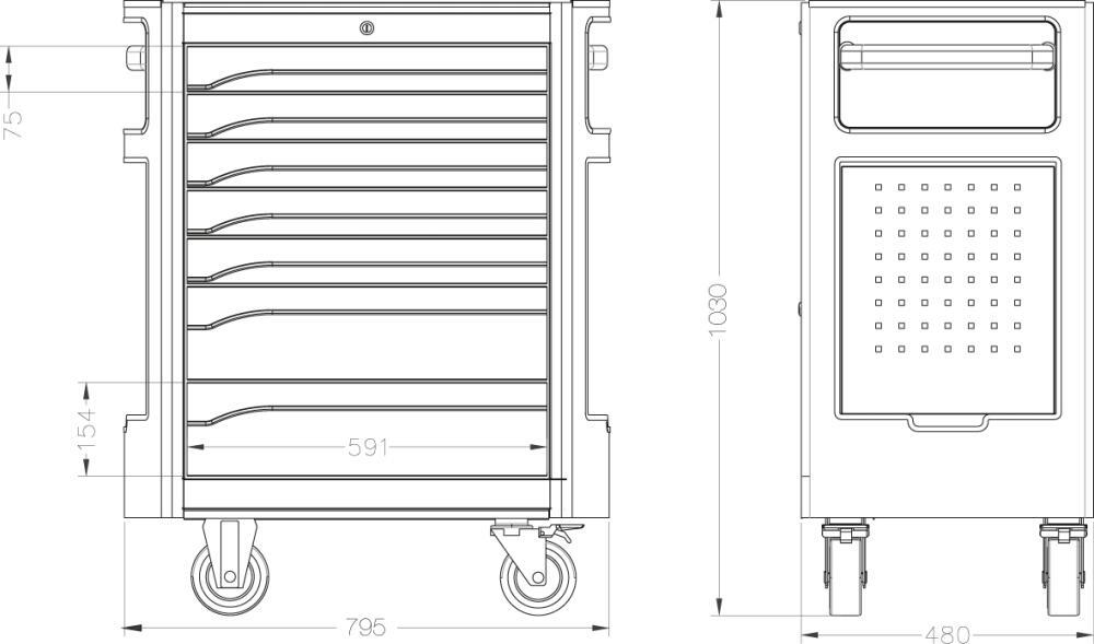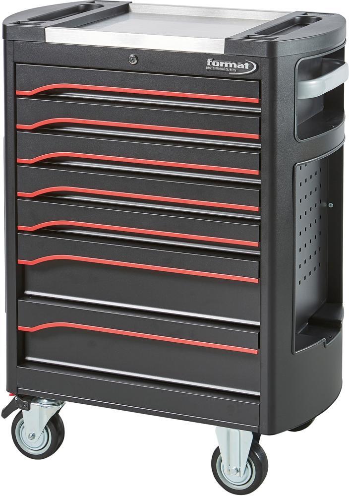 Dielenský vozík so sadou 116 ks Provedenie: Stabilná konštrukcia z oceľového plechu, zásuvky (všetky s možnosťou individuálneho rozdelenia) s plným výsuvom, jednotlivé blokovanie proti nežiaducemu otvoreniu počas presunu a vodicí koľajnice s guľkovými ložiskami. So 7 jednostrannými výsuvnými zásuvkami (5 x 75 mm výška (vhodné pre tri 1/3 moduly); 2 x 150 mm výška (vhodné pre tri 1/3 moduly)). Nerezová pracovná doska s plastovými policami vpravo a vľavo. Na oboch stranách so štvorcovým dierovaním (9 x 9 mm) pre upevnenie rôzneho príslušenstva. Centrálne uzamykateľný pomocou valčekového zámku. 2 vo vnútri umiestnené celogumové pojazdné kolieska a 2 celogumové otočné kolieska s brzdou koliesok na jednej strane (úplné zastavenie). Všetky kolieska sú uložené na guľkových ložiskách pre optimálny jazdný komfort. Povrch s práškovým povrchom. Rozsah dodávky: 1 nástrojový modul skrutkovačov 1/4" + 1/2", 59-dielny 18 krúžkových vidlicových kľúčov 8; 9; 10; 11; 12; 13; 14; 15; 16; 17; 18; 19; 21; 22; 24; 27; 30; 32 mm 1 ráčna s prepínacou páčkou 1/4", s 2-složkovou plastovou rukoväťou 10 vložiek pre šesťhranné nástrčné kľúče 1/4" 4; 5; 5,5; 6; 7; 8; 10; 11; 12; 13 mm 1 predĺženie 1/4" 50 mm 1 adaptér na bity 1/4" 1 ráčna s prepínacou páčkou 1/2", s 2-složkovou plastovou rukoväťou 17 vložiek pre šesťhranné nástrčné kľúče 1/2" 8; 10; 11; 12; 13; 14; 15; 16; 17; 18; 19; 21; 22; 24; 27; 30; 32 mm 8 adaptér-bitov 1/2" vnútorný šesťhran 4; 5; 6; 8; 10; 12; 14; 17 mm 2 predĺženia 1/2" 125; 250 mm 1 nástrojový modul súpravy ručného náradia, 57 ks 1 sada imbusových kľúčov, 9 ks, vnútorný šesťhran 1,5; 2; 2,5; 3; 4; 5; 6; 8; 10 mm 1 sada bitov, 37 kusov 4 skrutkovače s 2-složkovou plastovou rukoväťou, ploché 3; 3,5; 4; 5,5 mm 2 skrutkovače s 2-složkovou plastovou rukoväťou, krížová drážka PH 1; 2 1 kombinované kliešte 180 mm 1 úzke dlhé kliešte rovné, 200 mm 1 štípacie kliešte s bočným ostrím 160 mm 1 kliešte SIKO 250 mm 1 zámočnícke kladivo 500 g Výrobca: Einkaufsbüro Deutscher Eisenhändler GmbH, EDE Platz 1, 42389 Wuppertal, DE, +4920260960, webkontakt@ede.de