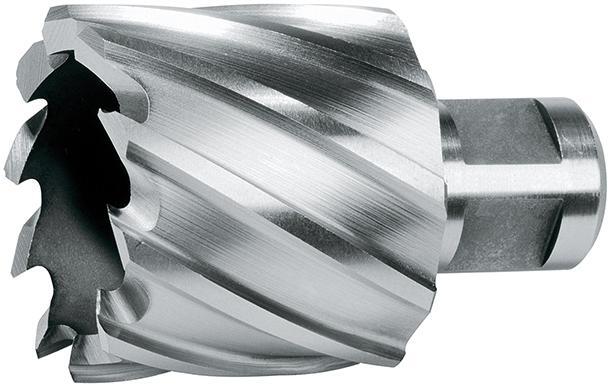 Jadrové vrtáky Vyhotovenie: Hĺbka rezu do 30 mm, so stopkou Weldon Ø 19 mm, brúsenie CBN, pravotočivý. Použitie: Na vŕtačkách s magnetickým stojanom a stojanových vŕtačkách s MK úchytom. Jadrový vrták obrába iba tenký krúžok materiálu. Odvŕtané jadro sa vyhadzuje pružinovou silou pomocou vodítka a vyhadzovacieho kolíka. Špony sú odvádzané nahor, nebezpečenstvo prasknutia sa znižuje na minimum. Taktiež vŕtané otvory s veľkým priemerom si vyžadujú relatívne málo energie. Jadrový vrták obrába v porovnaní so spirálovým vrtákom iba malú časť celkovej plochy. Týmto sa dosiahne veľká úspora času a vynaložených síl. Výrobca: Einkaufsbüro Deutscher Eisenhändler GmbH, EDE Platz 1, 42389 Wuppertal, DE, +4920260960, webkontakt@ede.de