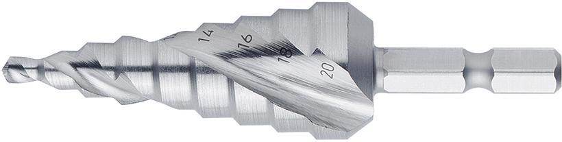 Stupňovitý vrták s bit stopkou 1/4" Provedení: HSS, spirálové drážkování. Vhodný k použití s ruční vrtačkou. Použití: Pro vrtání do plechů, trubek a profilů z ocelí do 850 N/mm², slitin hliníku, mědi, mosazi a bronzu bez otřepů. Kromě toho je také s určitými omezeními vhodný pro vrtání do ocelí do 1000 N/mm², nerezu a litinových materiálů. Výrobca: Einkaufsbüro Deutscher Eisenhändler GmbH, EDE Platz 1, 42389 Wuppertal, DE, +4920260960, webkontakt@ede.de
